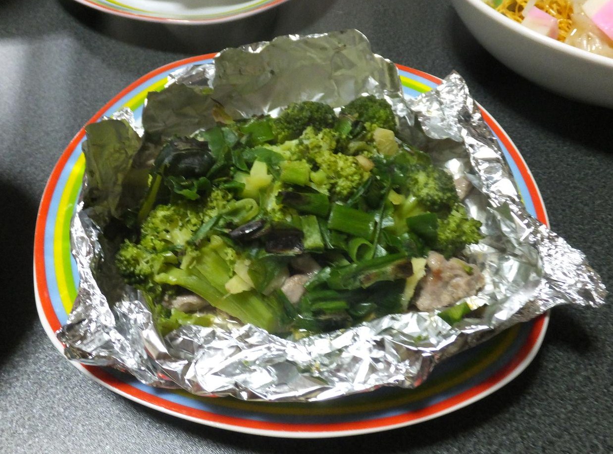 [ブロッコリーと豚肉と青ネギの巣籠り風包み焼き]