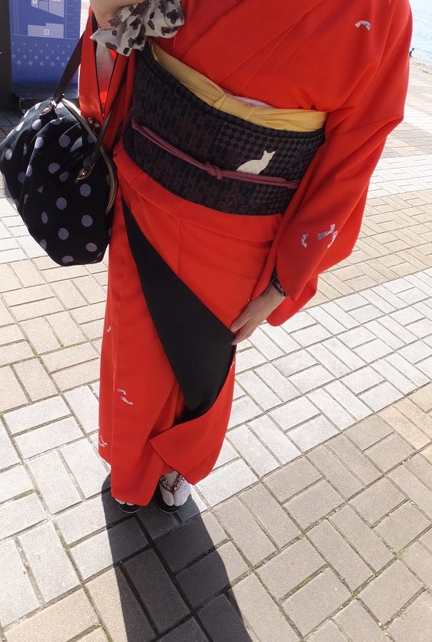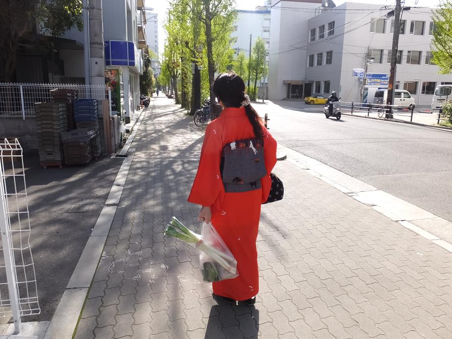 今治でも着た赤い小紋です。ヤフオクで反物を落札しました。