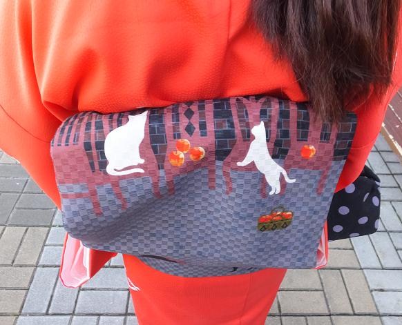 帯はお気に入りのネコ柄です。