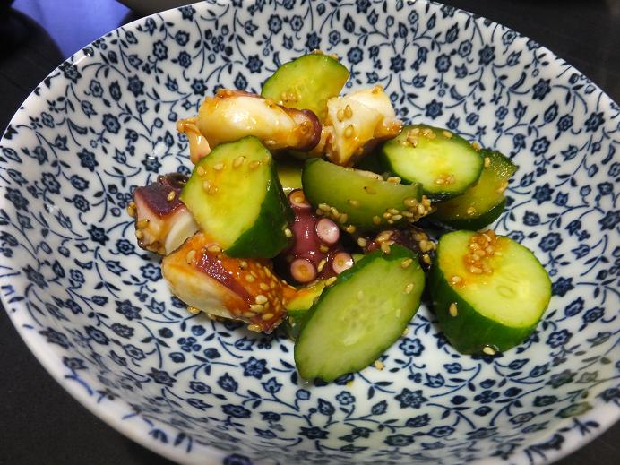 ③ボールにタコとキュウリを入れ、調味料を投入して混ぜる