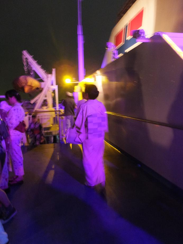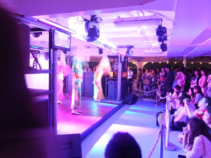 上のデッキはDJに浴衣ダンサーズの踊りも。すごい混雑してました。(写真がピンボケです)