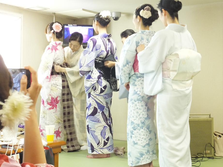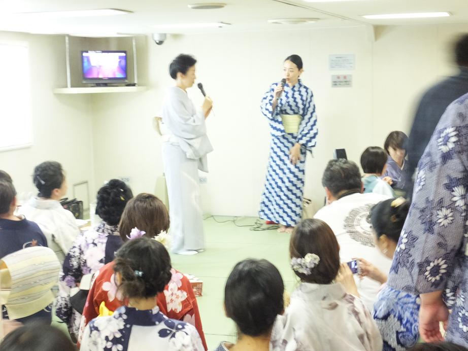 そうこうしてると、女子会の会場では浴衣の帯の変わり結びの講習会が始まりました。自由自由はかぶりつきで見ました。