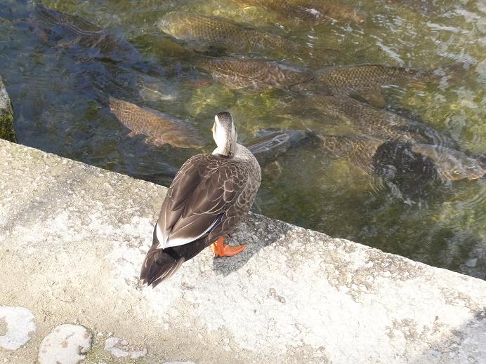 池の鯉を見つめる鴨。