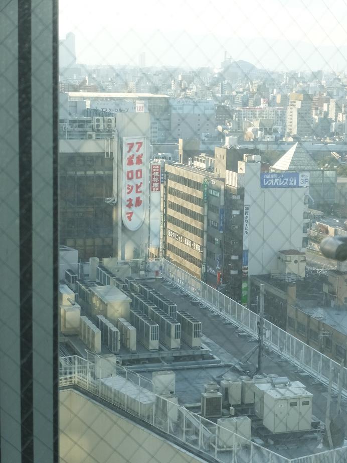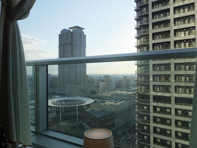 窓から見える円形はあべのキューズモ―ル 高いビルは前に泊ったトラスティ・ホテル