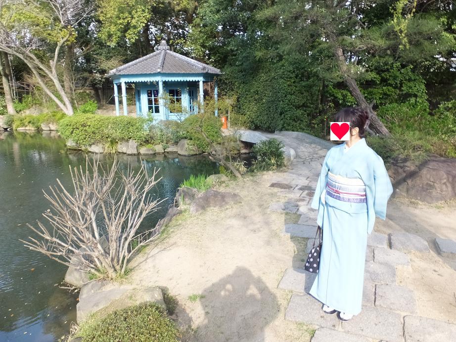 ブルーの建物は八角亭。ルネサンス様式で明治36年の内国勧業博覧会のパビリオンだったそうです。手前は極楽の池。