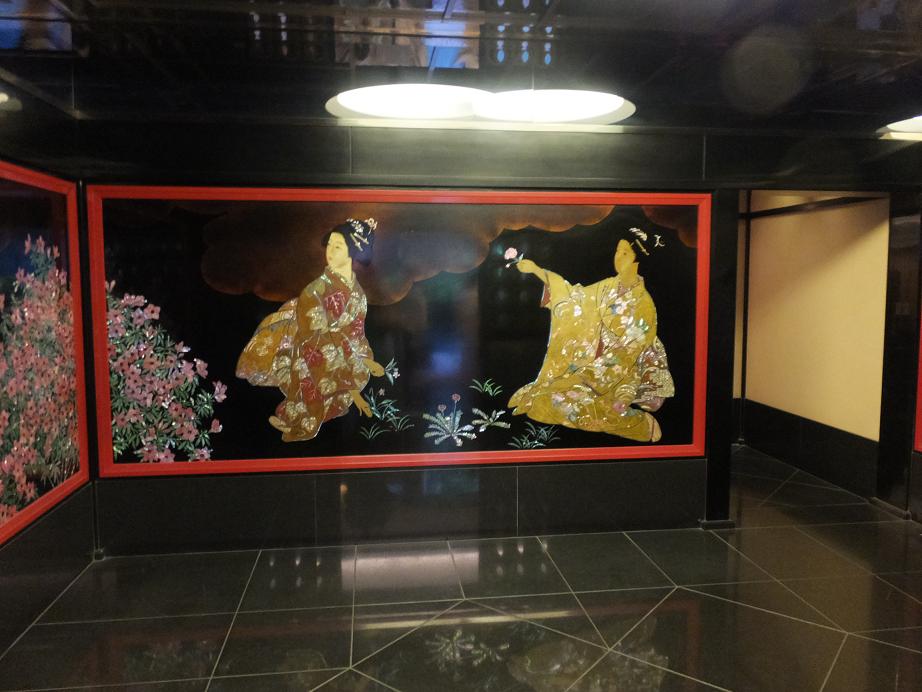 重厚なドア。これも螺鈿です。中は余裕で着替えも出来るくらい広くて快適でした。(いや、ひょっとしたら住めるかもしれない)