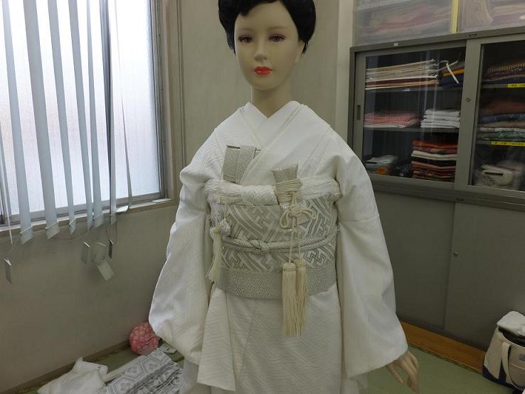 掛け下を着せて帯を結びます。一番格の高い丸帯で結びます。