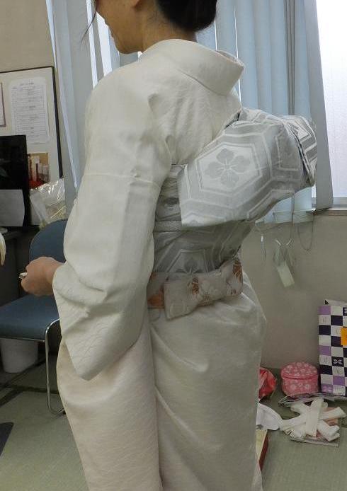 前半が補正を作って長襦袢を着せるところまで。1時間ひたすら綿をちぎってガーゼを切ってました。