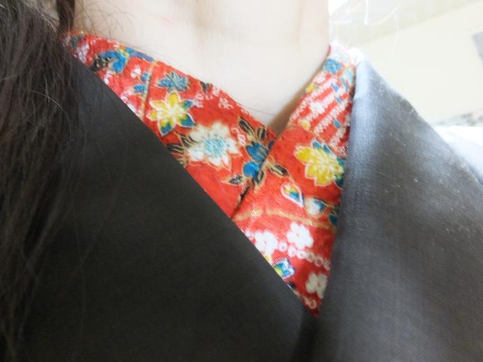 衿もとは可愛く友禅柄の半衿です。前の晩に一生懸命縫いつけました。ちょっとは上手くなったかな。