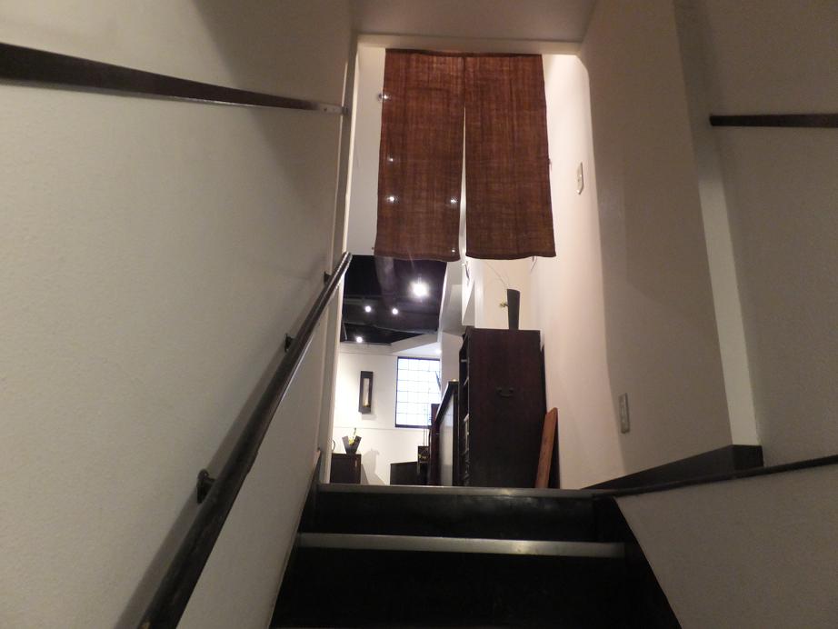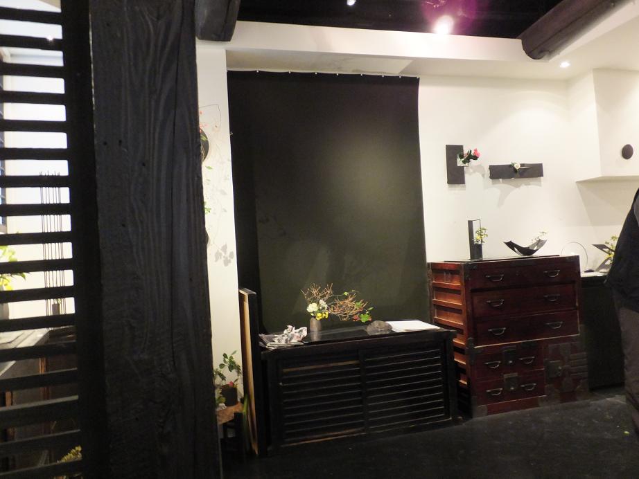 階段を昇ってすぐの壁はギャラリーの展示スペースになってます。生け花や花器が効果的にライトアップされてました。
