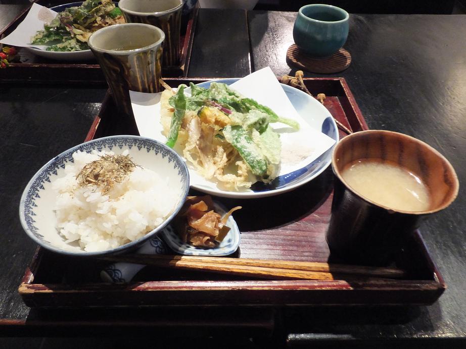山菜の天ぷらご飯を注文。料理の説明があったけどあまりの空腹でちゃんと聞いてませんでした。お味噌汁には帆立が入ってました。
