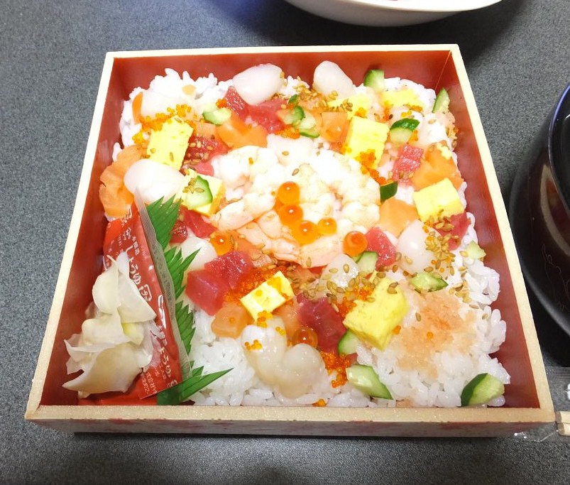 というわけで、今日の晩ごはんはスーパーのタイムサービスで買ったちらし寿司です。