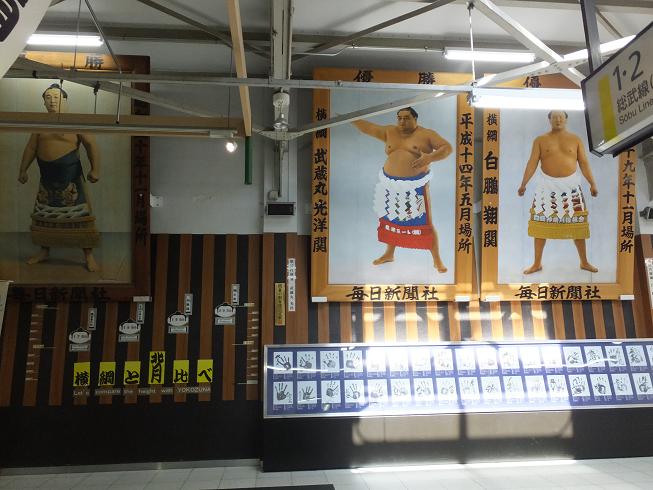 JR両国駅の構内。お相撲さんの大きな絵が飾られてます。白鳳、武蔵丸