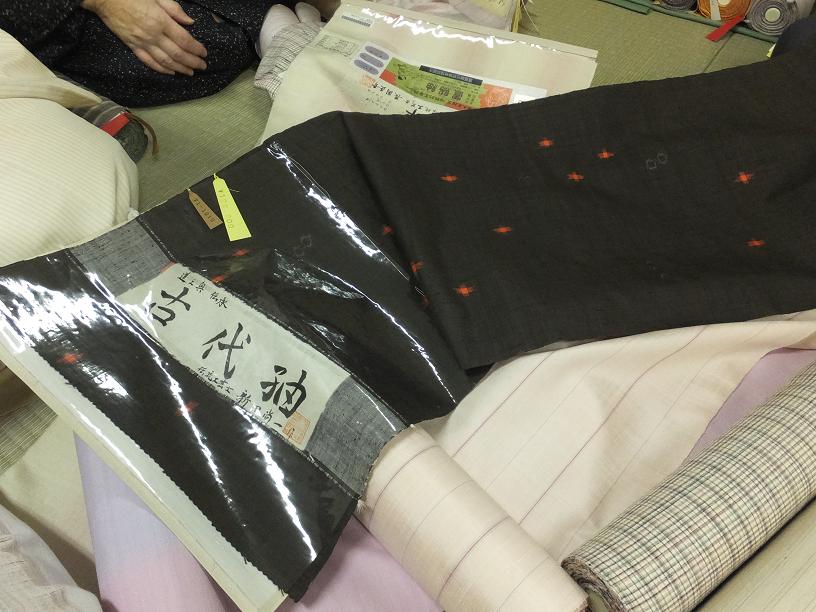 奥に安い特売コーナーがあり、赤の十字絣が可愛い「古代紬」発見。