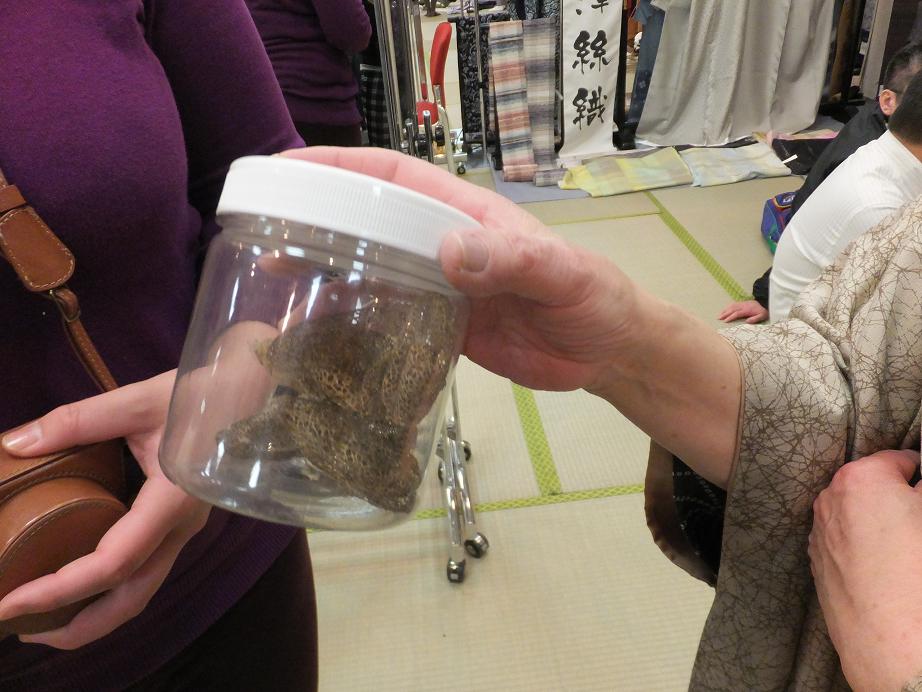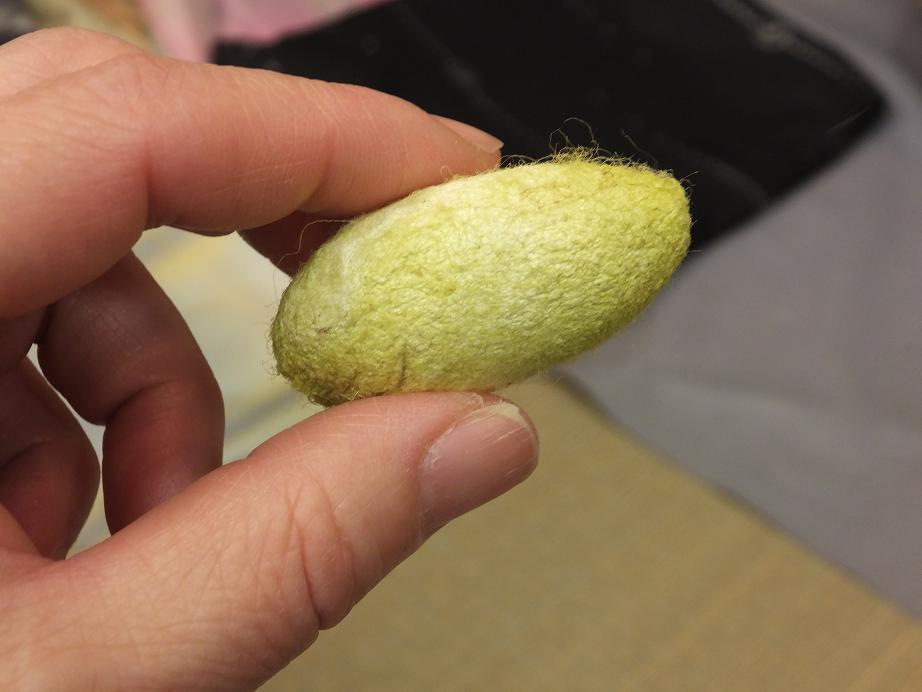 栗繭と言います。工房の人に教えてもらいました。栗の葉っぱのみを食べて育った野蚕の繭です。