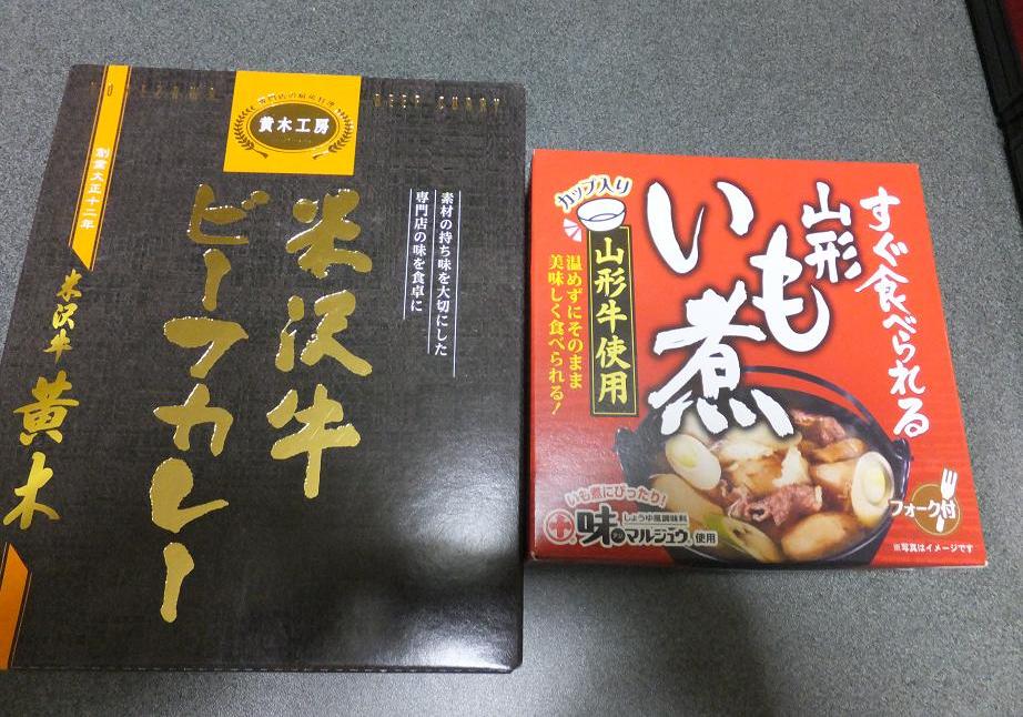 物産コーナーもあって、お土産に非常食になるいも煮と米沢牛ビーフカレーをお買い上げ。