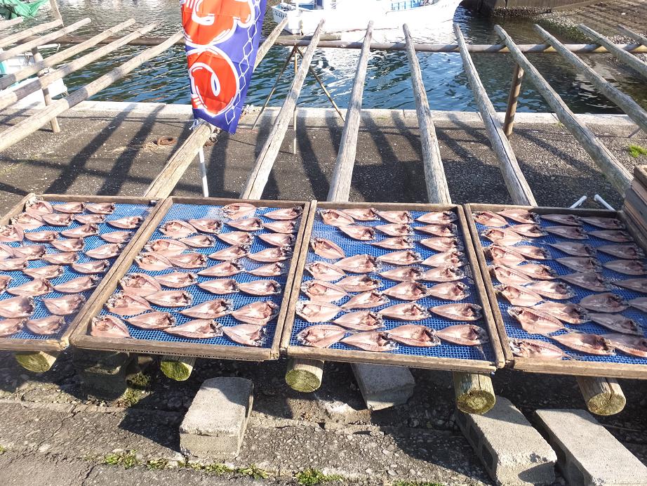 前は小さな漁港です。土産物屋さんの前にずら~っと魚が干してありました。