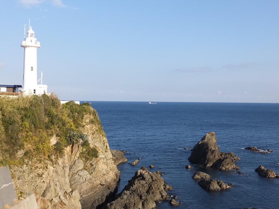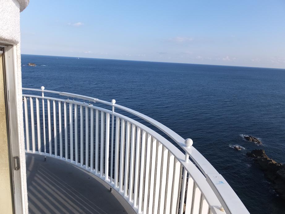 遠州灘と熊野灘がぶつかる海に波を切るように突出した岬に立ってます。1978年の大改修で今の白亜の姿になりました。さっそく昇ってみました。灯台から見下ろす太平洋。