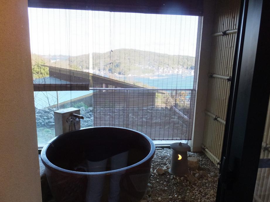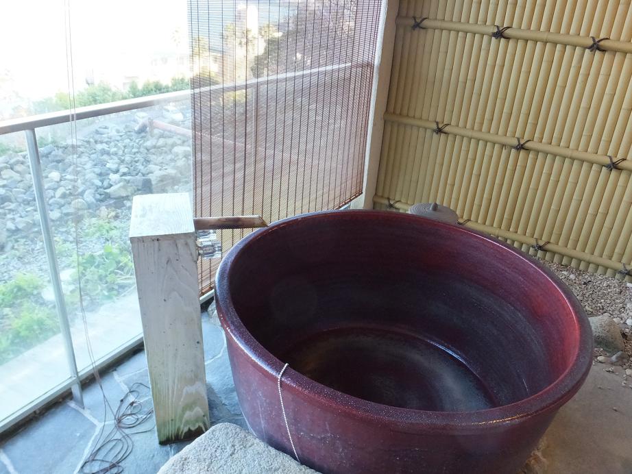 坂を登った高台にある旅館です。じゃじゃ~ん!!露天風呂付きの部屋です。