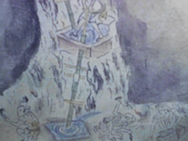 落盤しないように木組を作って行く人、のみで掘る人、掘った岩を運び出す人、地下水を汲み上げる人、坑内に空気を送る人、捨石場に石を拾いに集まってる女や子供の絵もありました。