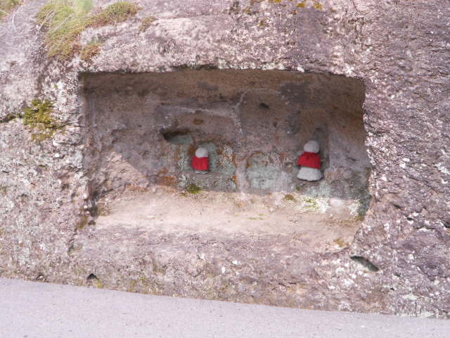 石段の左下に岩肌をくりぬいてお地蔵さんが。