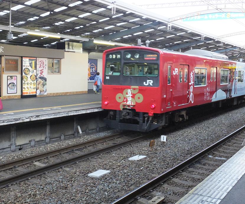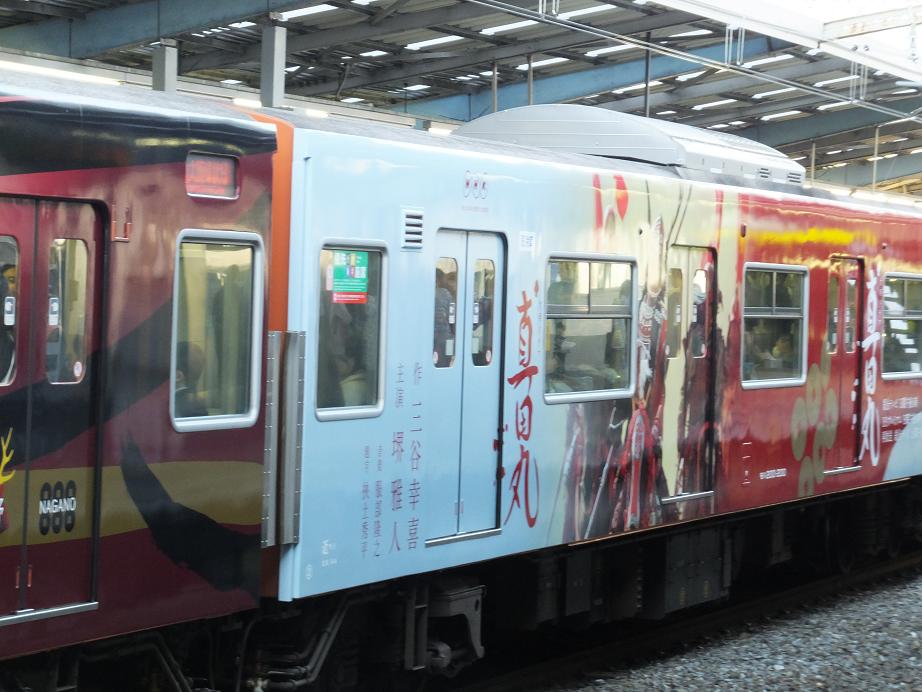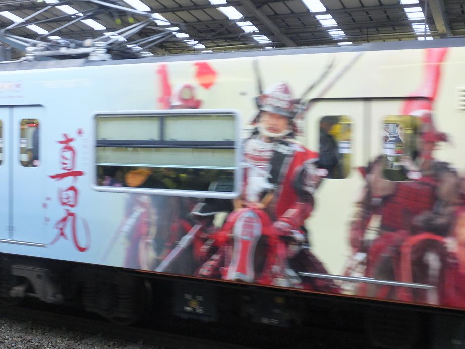 電車を待ってると、真田丸使様の電車が向かい側のホームにすべりこんで来ました。