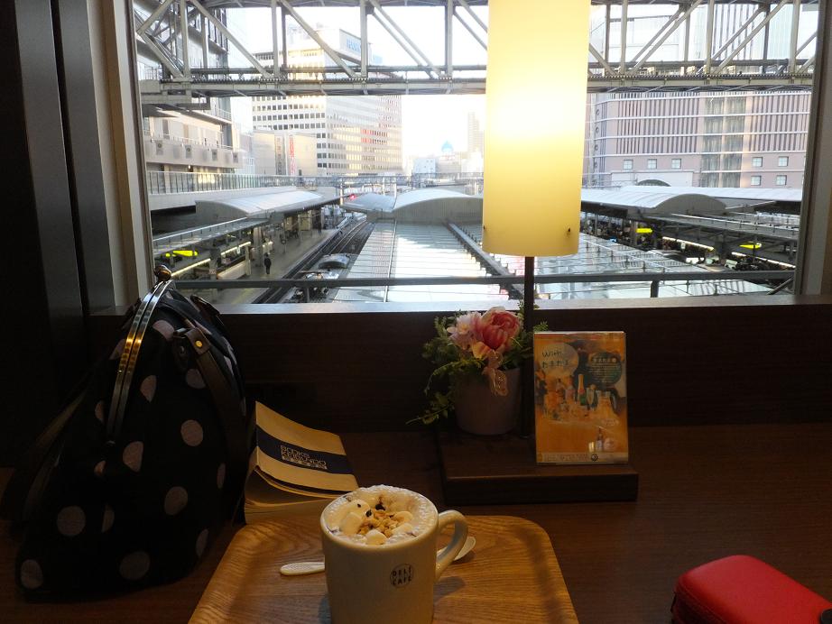 た~の乗った特急列車を窓に顔をすりつけて見送ったあと、大阪駅構内に素敵な眺めのカフェを発見。ちょうどカウンターのいい席が空いたので思わず入ってみました。