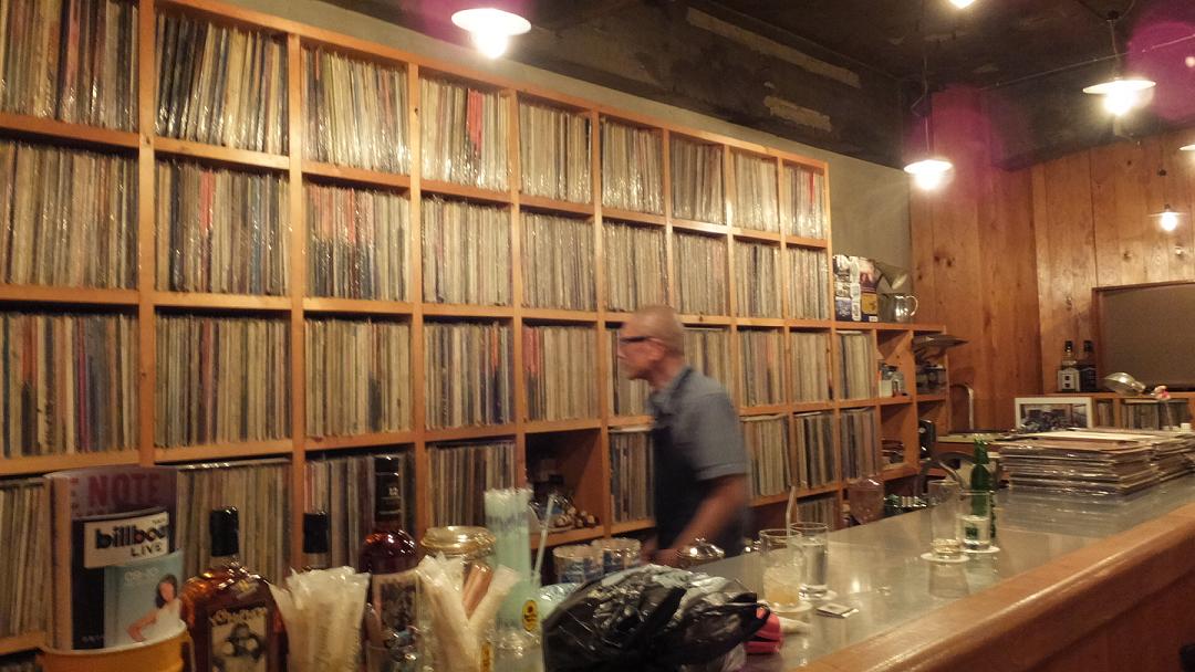 中はウッディな内装。壁一面のレコード。音は大きめです。