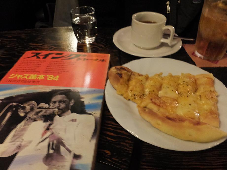 リクエストの順番待ちの間、昔のスイング・ジャーナルを読みながら注文したピザを食べます。