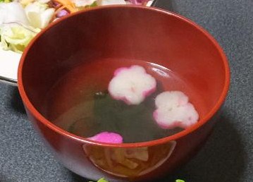 春らしく花麩をいれたお吸い物。これは自由自由の為かな?