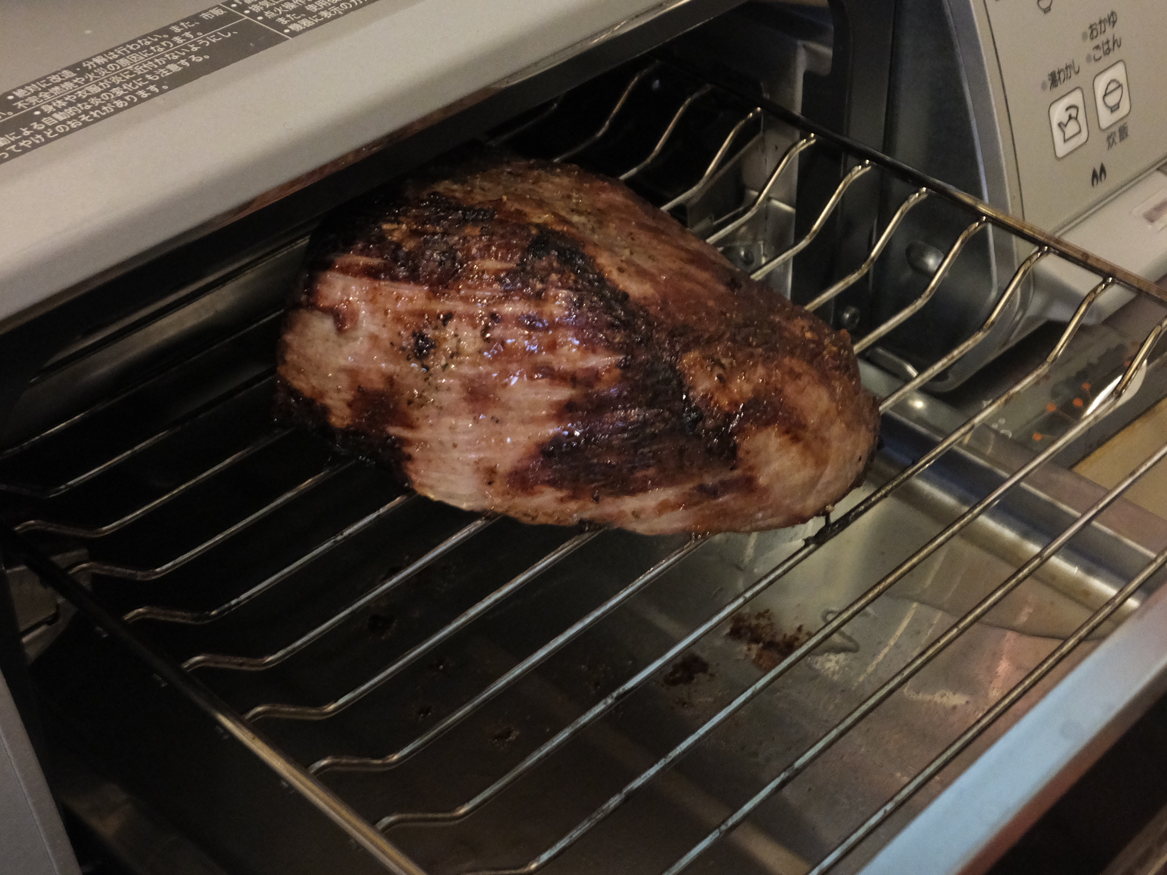 10分焼いたらこんな感じ。肉の高さが天板ギリギリでした。