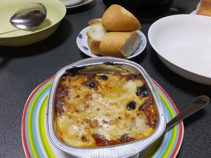 自由自由が作ったラザニア (市販のです)とバケットです。