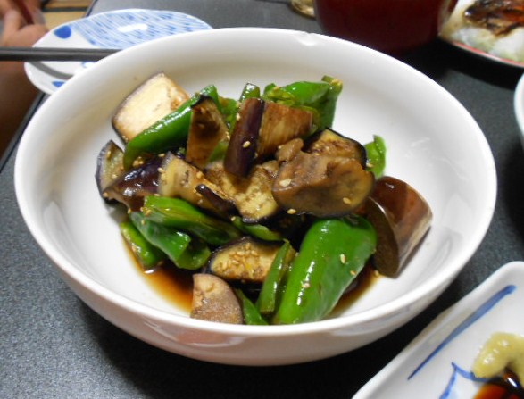①茄子、ピーマンは食べやすい大きさに乱切り、ごま油で炒める
