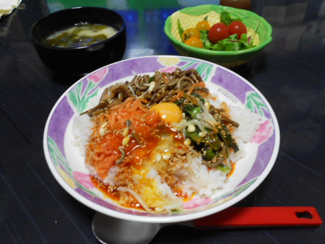 市販のナムルをあったかいご飯に乗せて、砂糖、酒、みりん、ごま油、にんにく、コチュジャンに醤油を絡め卵黄を乗せるだけで、むちゃおいしいビビンバの完成です。(焼き肉のたれでもOKです。)白ゴマも忘れずに。