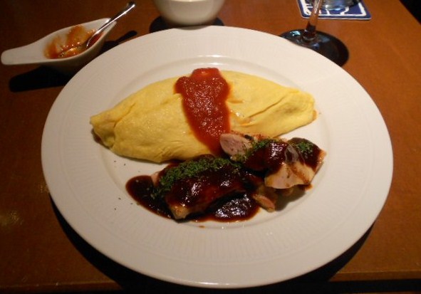 オムライスとデミグラスソースがかかった鶏肉のソテー