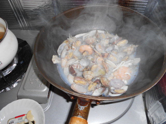 フライパンにオリーブ・オイルをひき、にんにくのスライスを炒め、香りが出てきたらエビ、続いてイカ、貝類を投入。