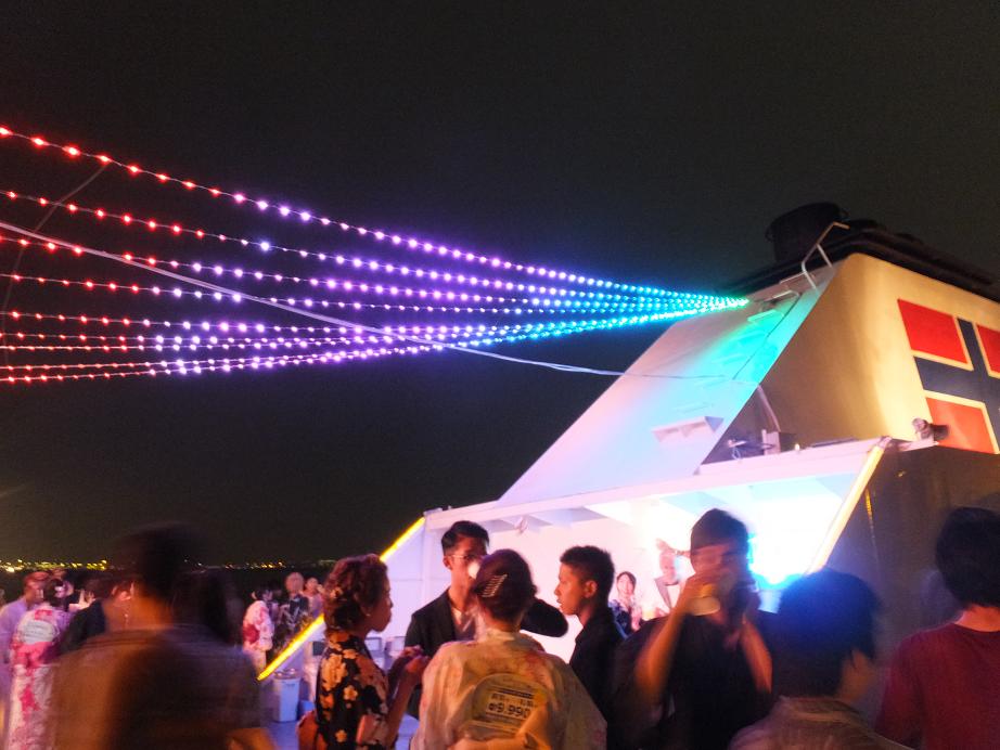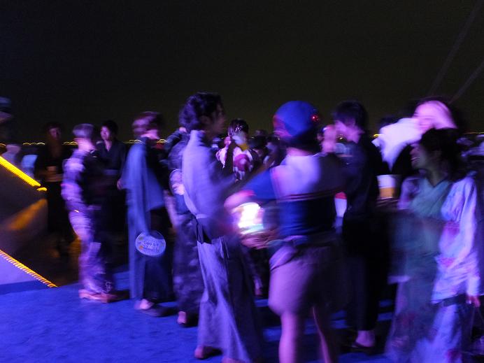 上のデッキはDJに浴衣ダンサーズの踊りも。すごい混雑してました。(写真がピンボケです)