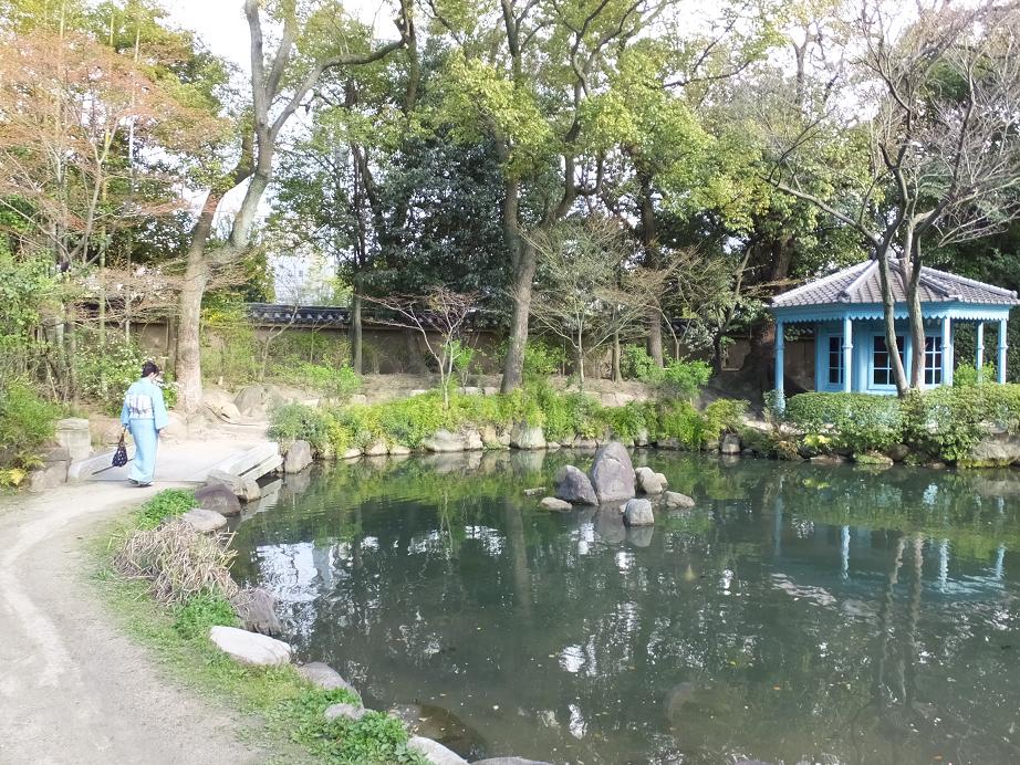 ブルーの建物は八角亭。ルネサンス様式で明治36年の内国勧業博覧会のパビリオンだったそうです。手前は極楽の池。