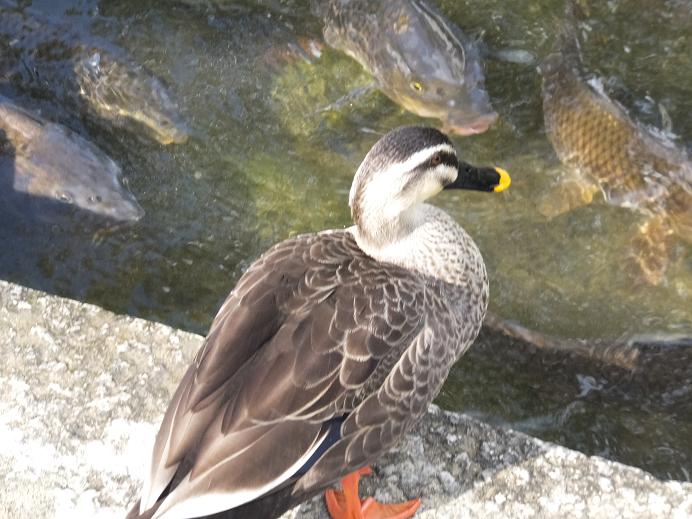 池の鯉を見つめる鴨。