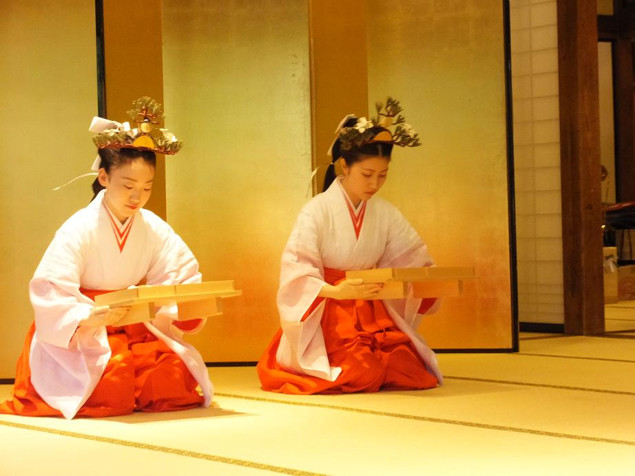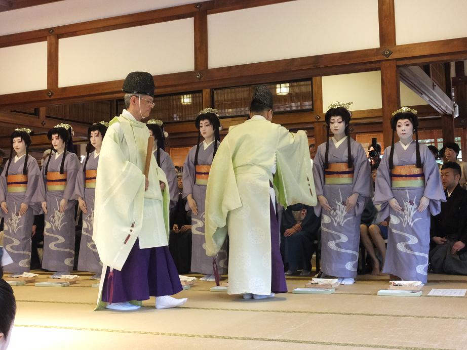 後ろの女性は御稔女(みとしめ)と言って舞いを奉納します。