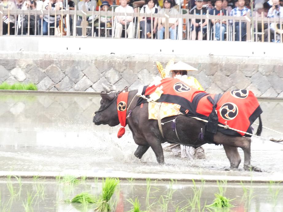 あらかじめ7割がた苗が植えられています。一区画だけ何もないところがあってそこを斎牛が耕します。ちょっとおびえていましたがおそるおそるチャポンと入りました。