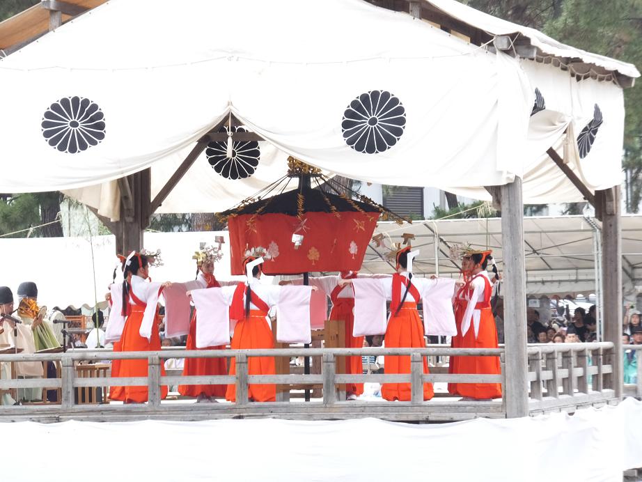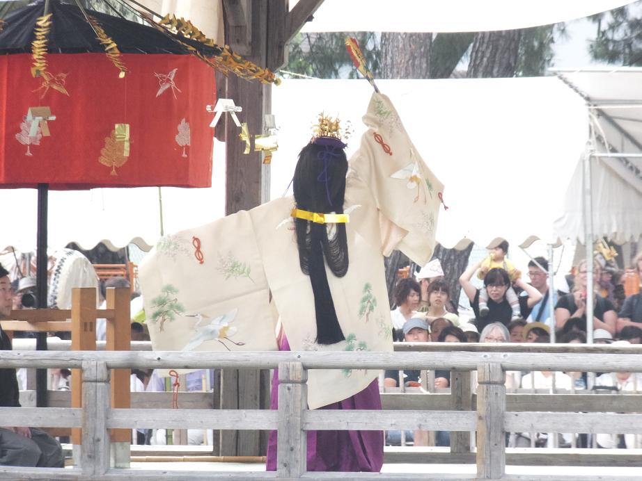 最初は雅楽の演奏で静かに舞うのですが、途中早着替えをして竜神の冠をいただきます。