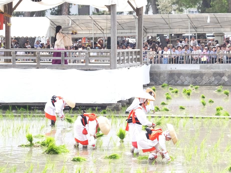 八乙女による田舞(たまい)が舞われてる間、田植えが始まります。