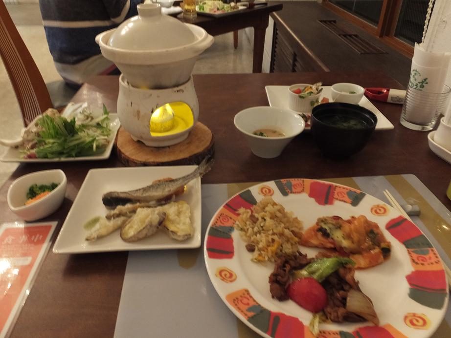 夕食はバイキングです。料理の品数の多さに圧倒。食べきれない。