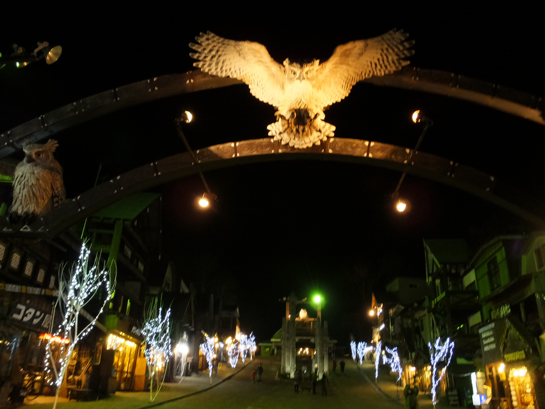 昼間のせいか閑散としてました。入口にはフクロウがお出迎え。