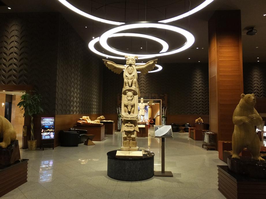 別館の「鶴雅ウイングス」のロビーにはアイヌの彫刻がたくさん。昼間行った熊の店の藤戸竹喜さんの作品もあります。