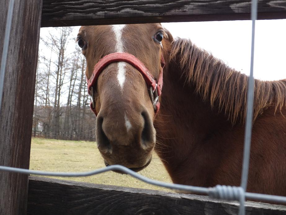 遊歩道をず~っと歩いて行くと放牧されてる馬が見えました。餌を食べてましたが、私が呼ぶと「ん?」という顔でこっちに来てくれました。