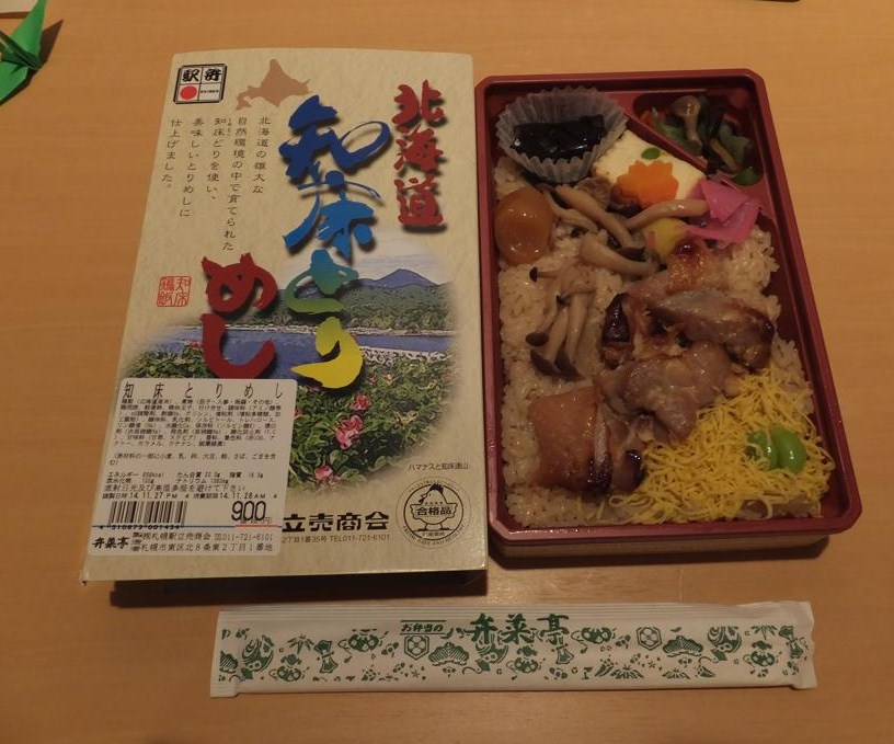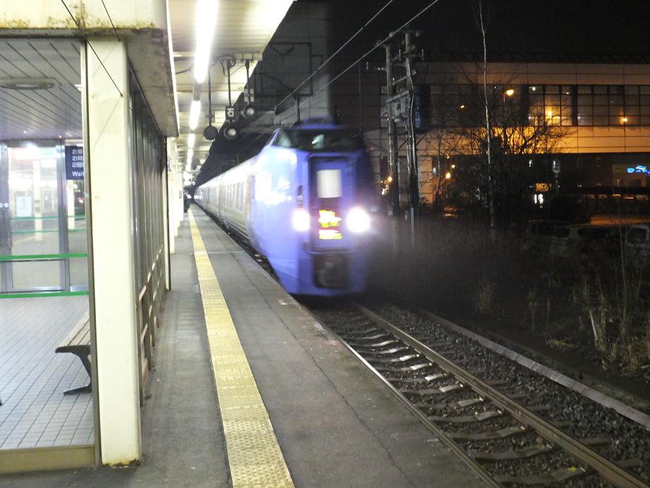 列車の中は札幌からのビジネスマンで満席。中は暖房が最高に効いててモコモコの格好の自由自由は浮いてました。