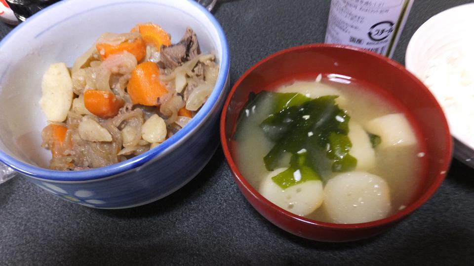 前日私が大量に作った肉じゃがの残りも。お味噌汁はお麩とわかめ