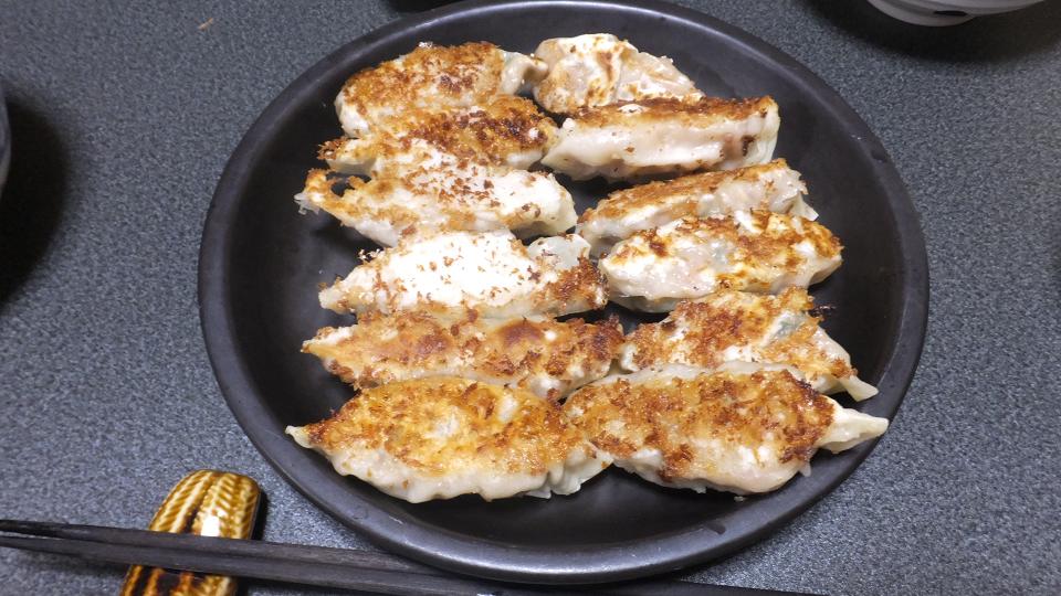 餃子を並べて水を差しすぐ蓋をして強火のまま焼きます。水分が飛んだら完成です。